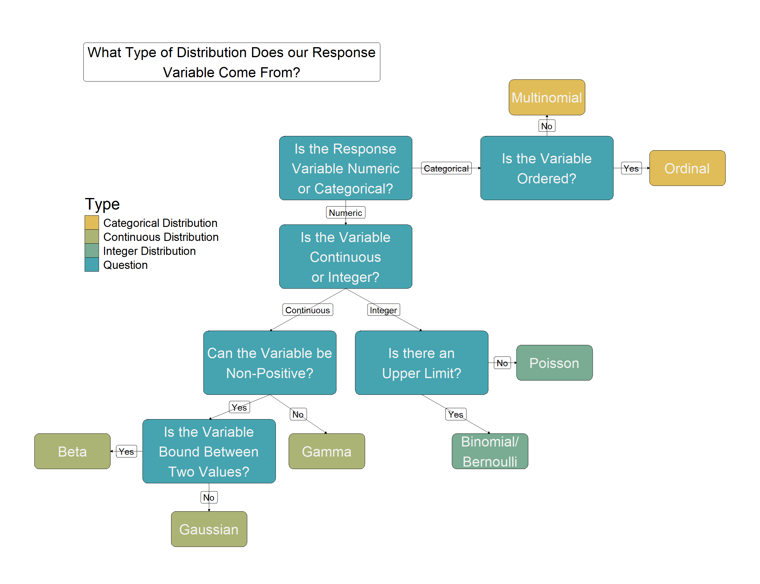 The type of data your response variable comes from may not be exactly what your response variable data looks like! However, if we have sufficiently sampled the population and not introduced any selection or sampling bias we should be confident in saying our sample (response variable) comes from the distribution of the population. We should be aware of this when analysing data from specific geographies or demographics etc!!!