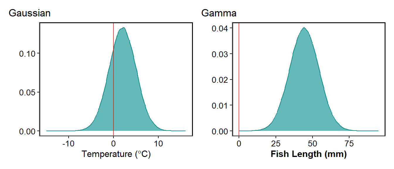 Once we know our data are continuous numeric, we can think can the values be negative? A response variable that is continuous and can be negative is mostly modelled under the most common distribution: Gaussian. Examples of this could be temperature measured in \(^\circ\)C or acceleration. A response variable that cannot be negative or even 0, would most correctly be: Gamma. However, Gaussian models are very often used for these models as a Guassian distribution is simpler computationally and mathematically, and only really causes issues when the values approach 0. This is actually most continuous values we measure, such as thickness of a stem, fish length, body mass or area of habitat.