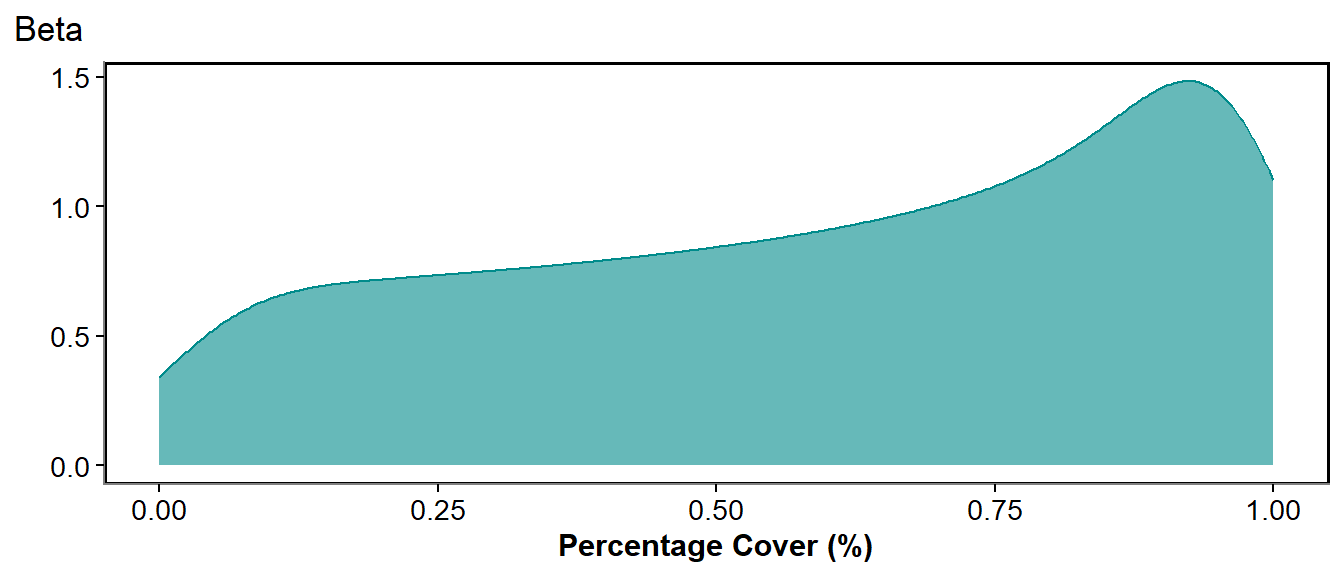 The first of these equations (the distribution equation) is saying that the data we sampled (\(s\)) comes from some distribution, with certain shape parameters (\(y'\) and \(\sigma\)). \(y\) is the result of an effect (\(\beta\)) multiplied by some fixed effect (\(x\)) and an intercept value (\(alpha\)). Between these two equations we have a link function (\(f()\)). This converts \(y\) into a value that the distribution function will accept \(y'\), again we will define what these elements are later. The elements that we want our GLM to tell us is the effect of x (\(\beta\)) and the intercept (\(\alpha\)). We don’t have to do maths at all for GLMs but it can help some people understand what the model is telling us. (If you don’t like equations/maths ignore this bit - But we will discuss link functions later on).