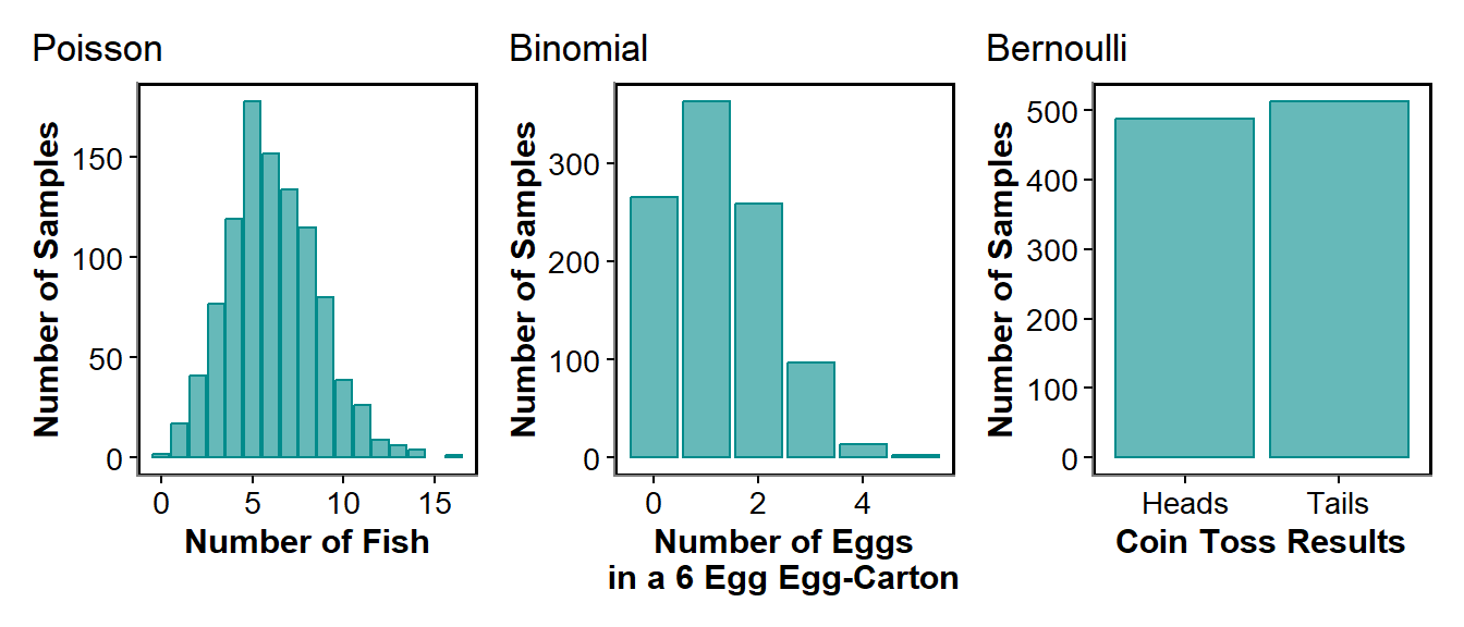 We know our data are integers but do we know whether there is an upper limit? If our data could potentially be very big as counts then we will use the Poisson distribution. This is for response variables like number of eggs in a nest or abundance of fish or the number of different species found along a transect. If we know there is an upper limit to the integers we could get then we will use a Binomial model. This could be for the number of eggs inside a six egg carton. The most common version of this is when we have a binary response variable (either 1 or 0). Presence or absence of a rare species for example. This is binary Binomial but is sometimes referred to specifically as Bernoulli.