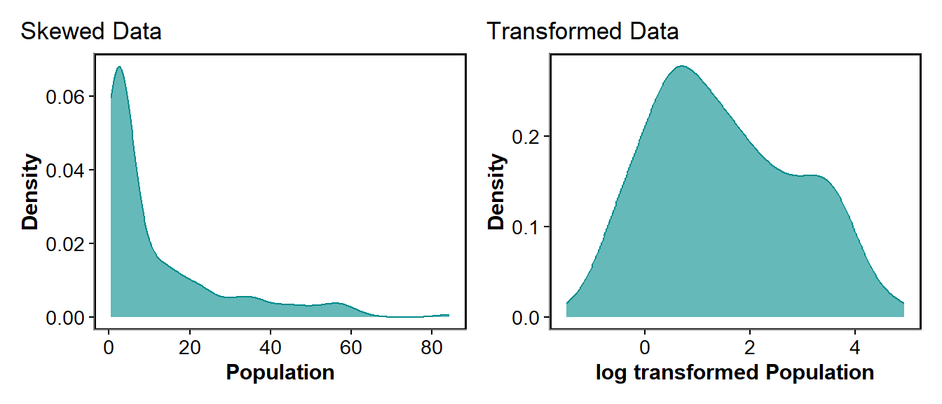 For example for skewed data, if our fixed effect was based on population size with the nearest 2 km, we may have some seriously big values in cities and seriously small values in the countryside. For these data we may use a log transformation, or a square root.