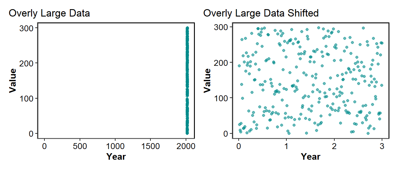 If our fixed effect was a really big value but actually we are interested in small changes we might consider it differently. For example we might look at Year, in our data that would be above 2000 generally but actually if we have 5 years of data we are looking at it would be easier for the model to convert our data to year 1, year 2, year 2 rather than 2020, 2021, 2022. Here we maintain the difference of 1 year between each value so change the scale.