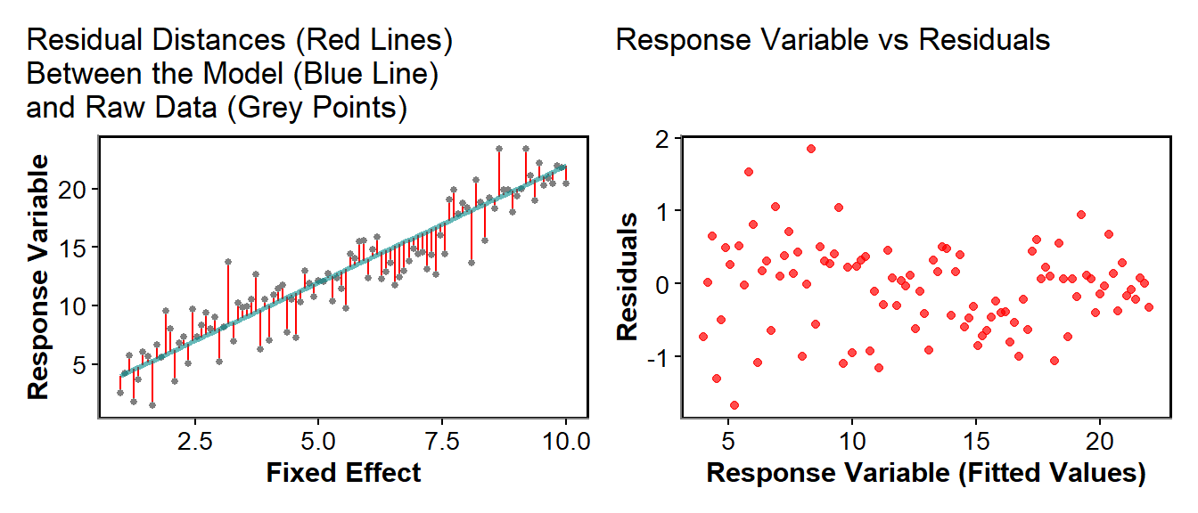 To assess the assumptions of our models we can look at the residual distance between the model line and the points, these are called the residuals of the model.