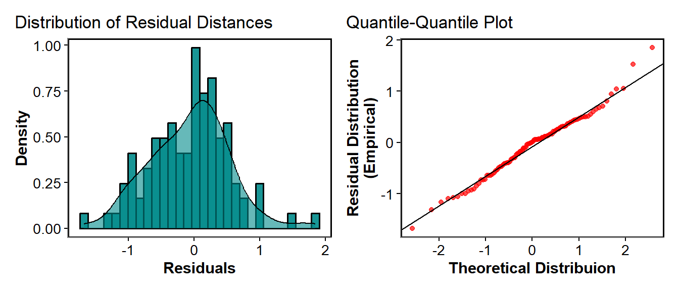 For the vast majority of GLM and GLMMs, there is an assumption that our residuals are normally distributed. Basically this means that our residuals have a mean distance from the model and most of the values are around this mean. Then the likelihood or probability of having much larger or much smaller values than the mean becomes smaller and smaller. We can therefore plot our residuals as a histogram to see if it follows a generally normal or bell shaped distribution. We can also do what is called a Quantile-Quantile plot, which creates a theoretical distribution of values given the data range, then plots it against the empirical or true distribution. If the residual distribution are perfectly the same as the theoretical distribution it follows a 1 to 1 line (y=x). Again these are more qualitative checks where some variation and divergence from normality is fine.